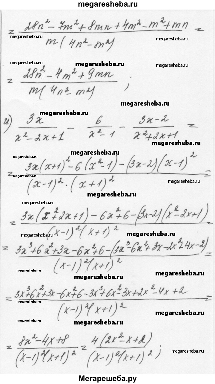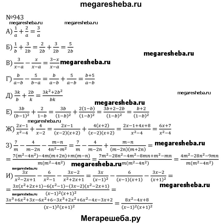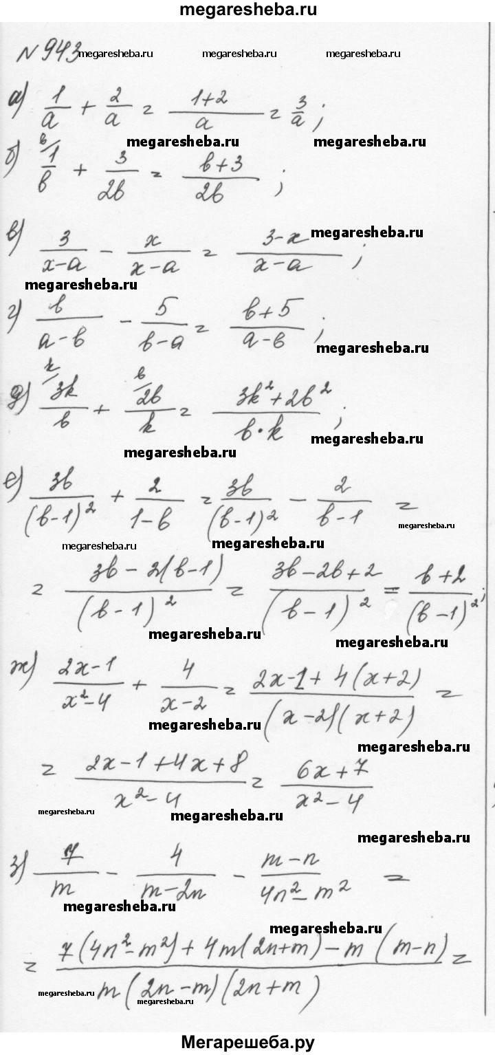Упростите выражение (943—944): 943 а) 1/a+2/a; б) 1/b+3/2b; в) 3/(x-a)-x/(x-a); г) b/(a-b)-5/(b-a); д) 3k/b + 2b/k; е) 3b/(b-1)2 + 2/(1-b); ж) (2x-1)/(x2-4) + 4/(x-2); з) 7/m - 4/(m-2n) - (m-n)/(4n2-m2); и) 3x/(x2-2x+1) - 6/(x2-1) - (3x-2)/(x2+2x+1).
