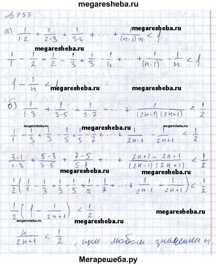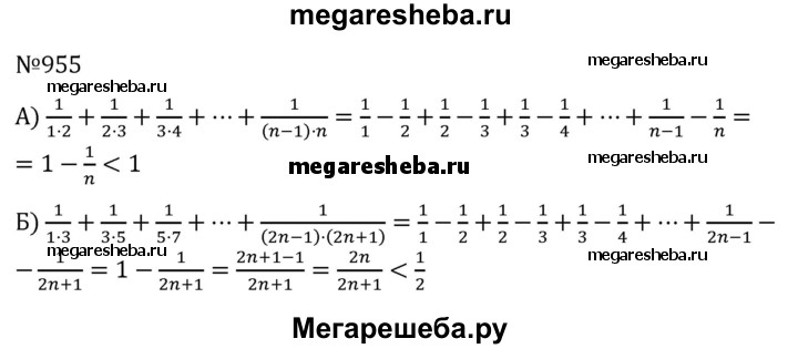 955. Доказываем. Докажите, что при любом натуральном n: а) 1/(1*2) + 1/(2*3) + 1/(3*4) + .. + 1/(n-1)*n<1; б) 1/(1*3) + 1/(3*5) + 1/(5*7) + .. + 1/(2n-1)*(2n+1) <1/2.