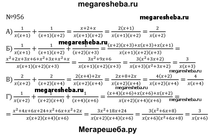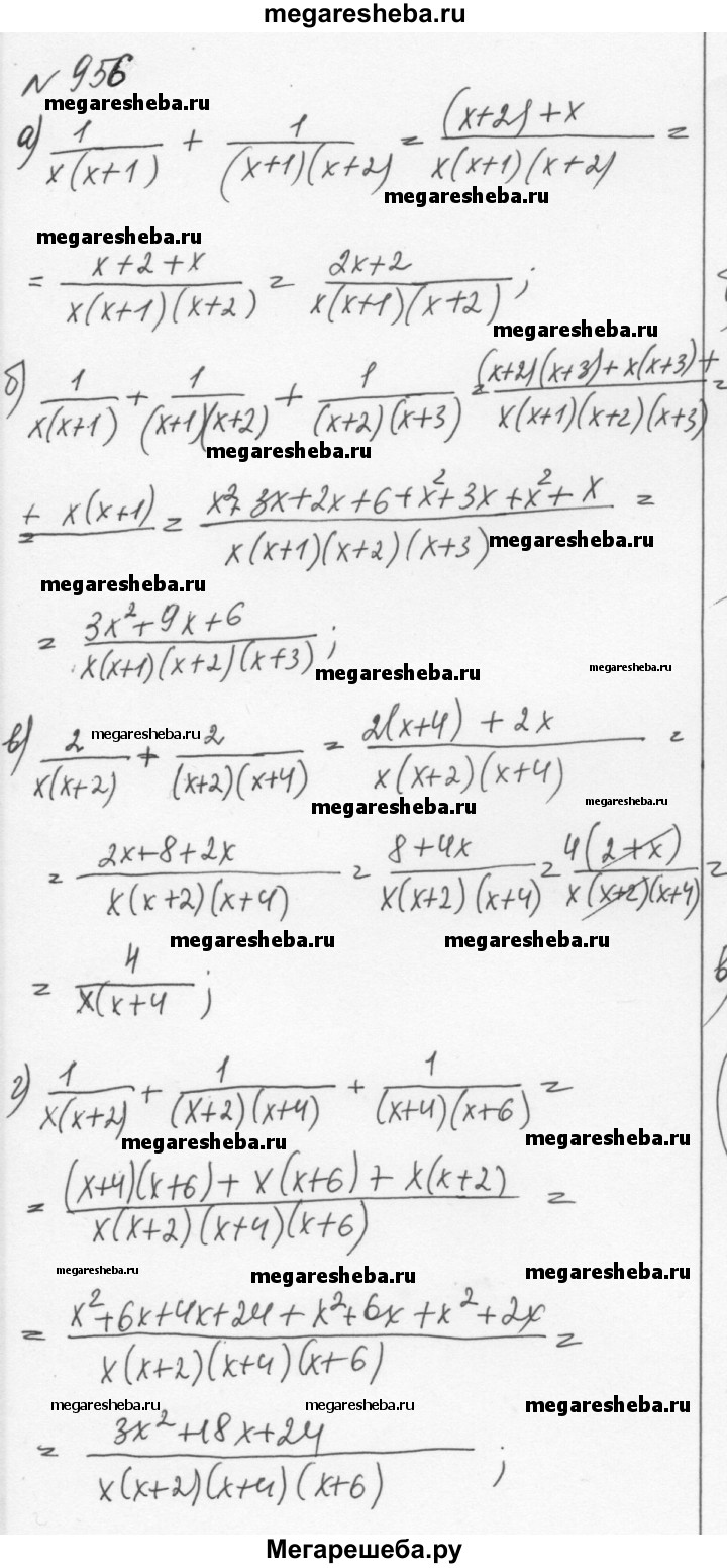 956. Упростите выражение: а) 1/x(x+1) + 1/(x-1)(x+2); б) 1/x(x+1) + 1/(x+1)(x+2) + 1/(x+2)(x+3); в) 2/x(x+2) + 2/(x+2)(x+4); г) 1/x(x+2) + 1/(x+2)(x+4) + 1/(x+4)(x+6).