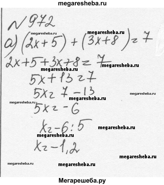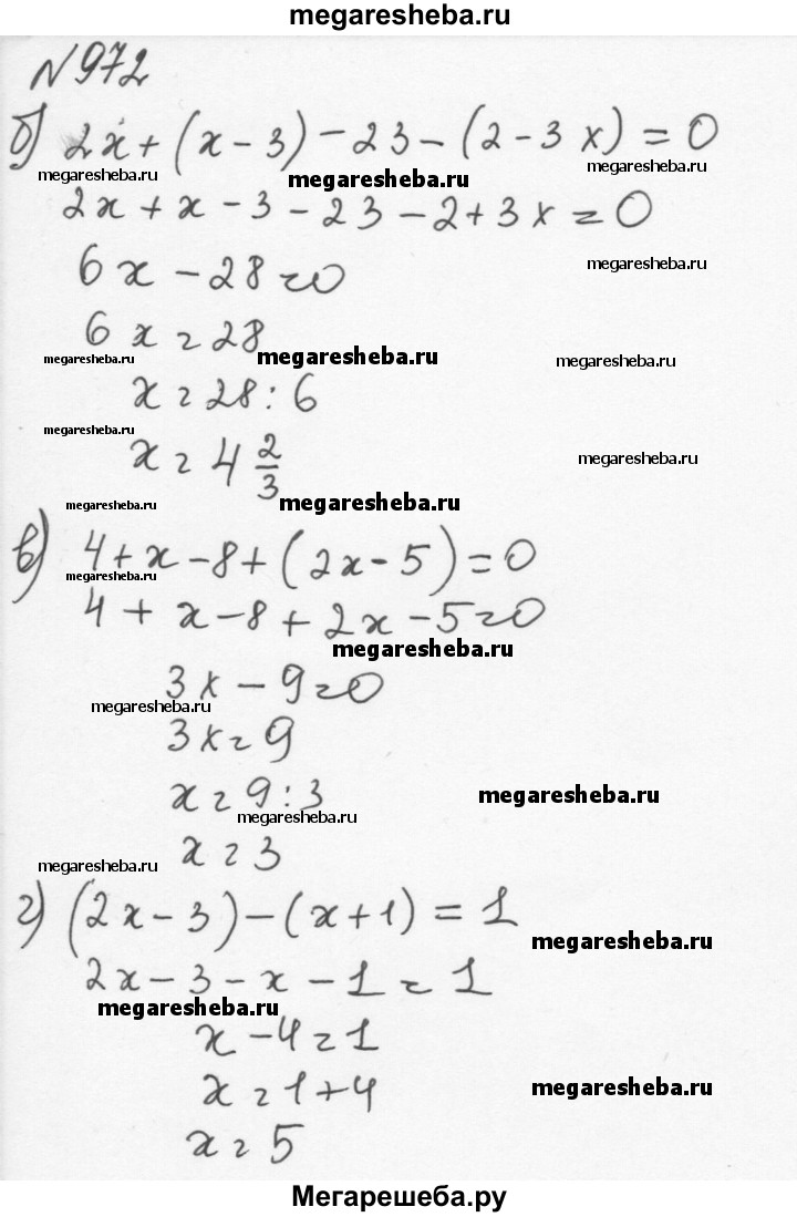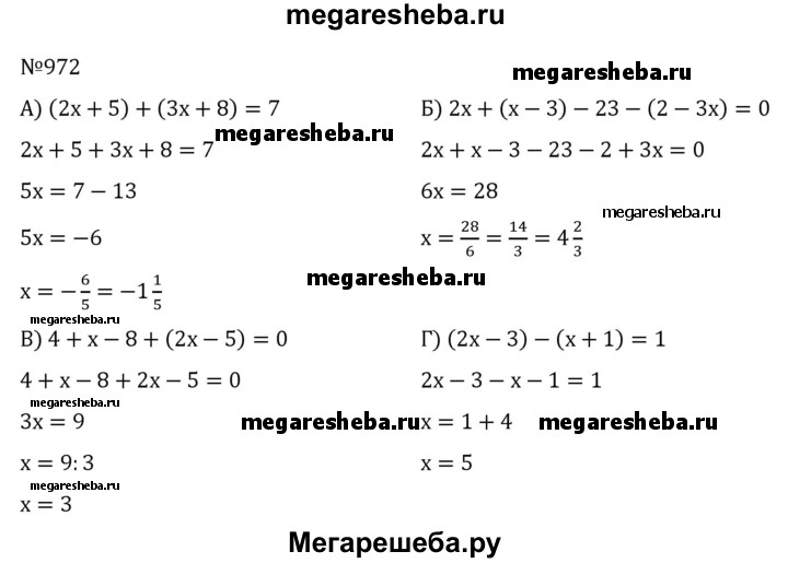 972 а) (2х + 5) + (Зx + 8) = 7; б) 2х + (х - 3) - 23 - (2 - Зх) = 0; в) 4 + х - 8 + (2х - 5) = 0; г) (2х - 3) - (х + 1) = 1.