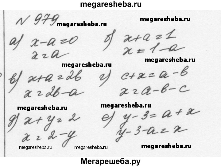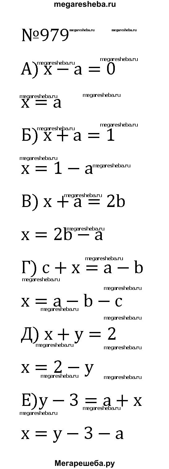 979 Решите уравнение, считая, что а, b, с, у — данные числа, а х - неизвестное (979—982): а) x-a=0; б) x+a=1; в) x+a=2b; г) c+x=a-b; д) x+y=2; е) y-3=a+x.