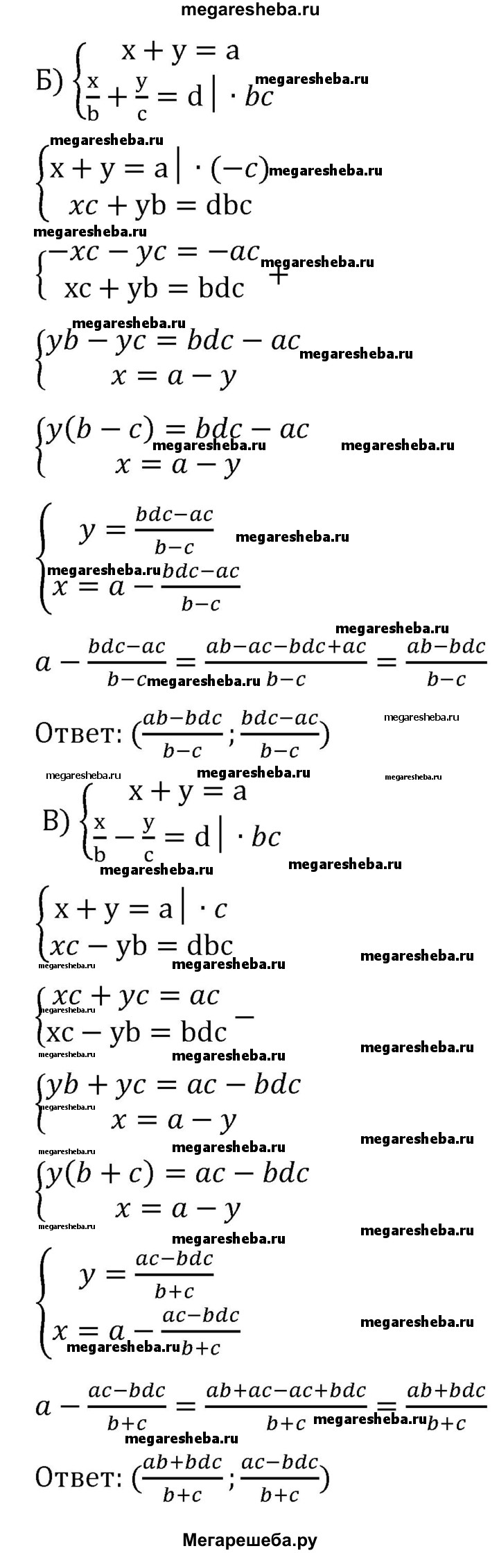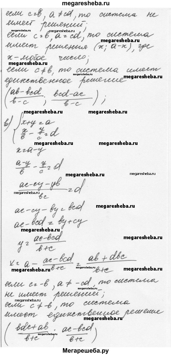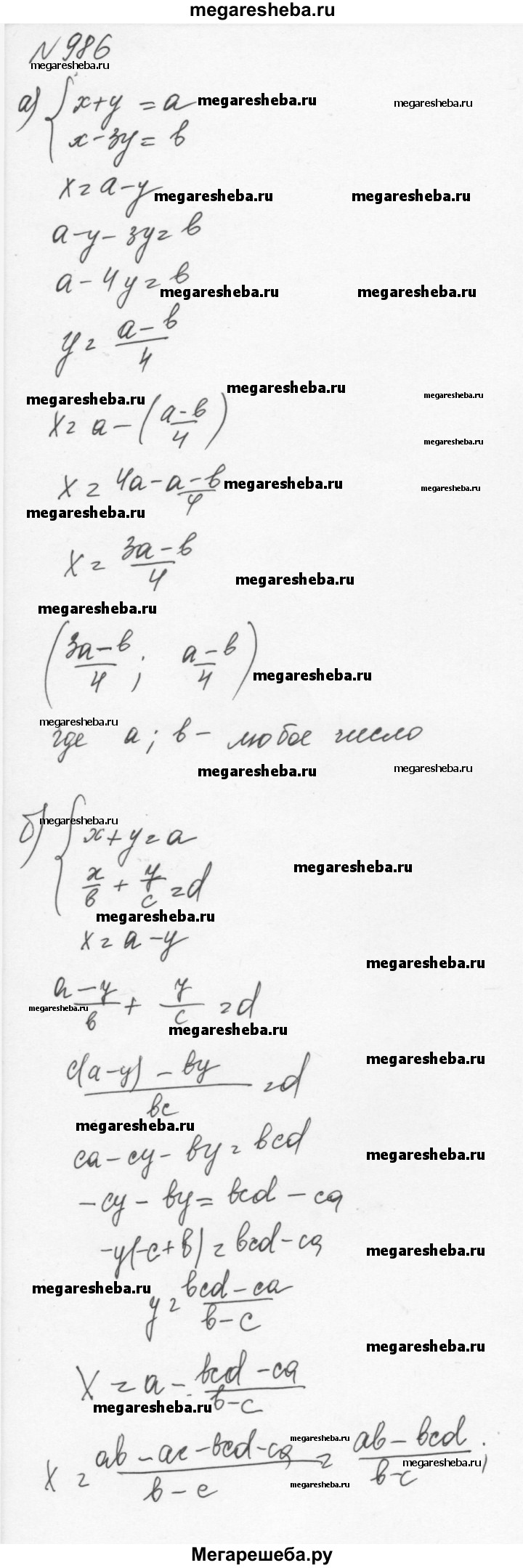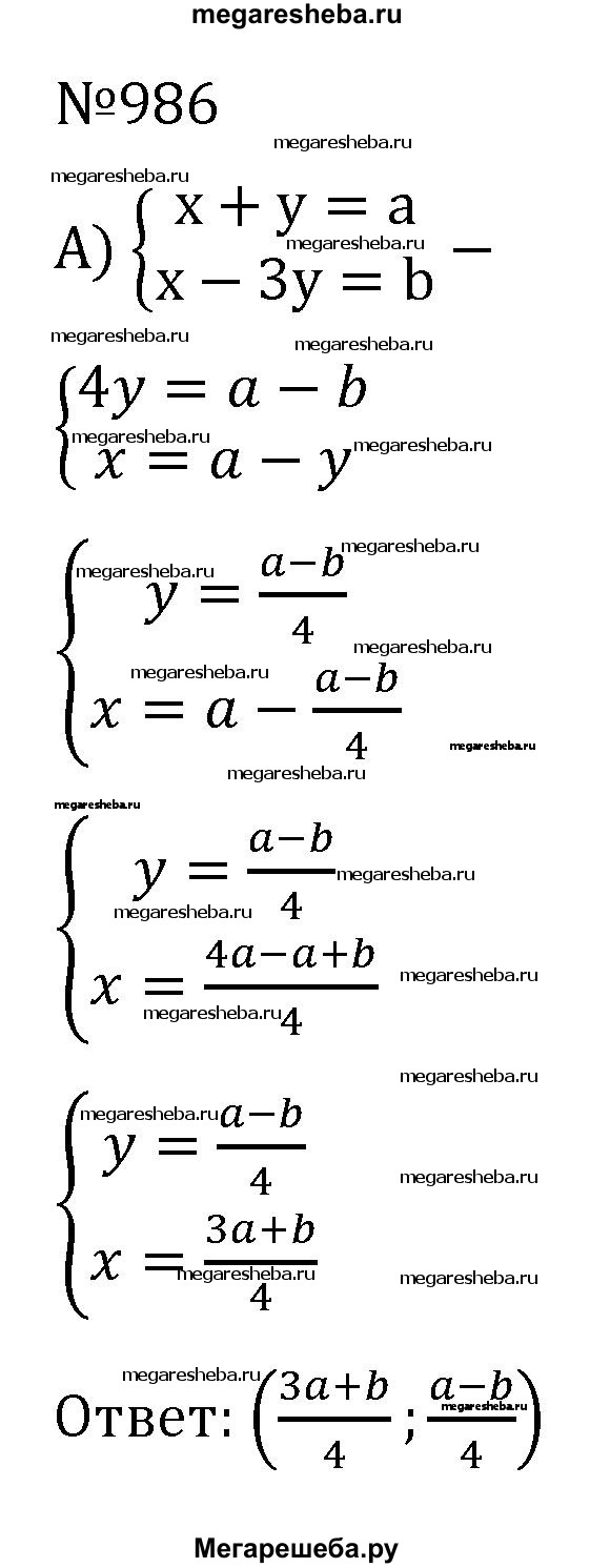986. Из «Арифметики» Диофанта (III в.). Решите системы для всех возможных значений а, b, с и d: а) {x+y=a, x-3y=b; б) { x+y=a, x/b+y/c=d; в) { x+y=a, x/b-y/c=d.