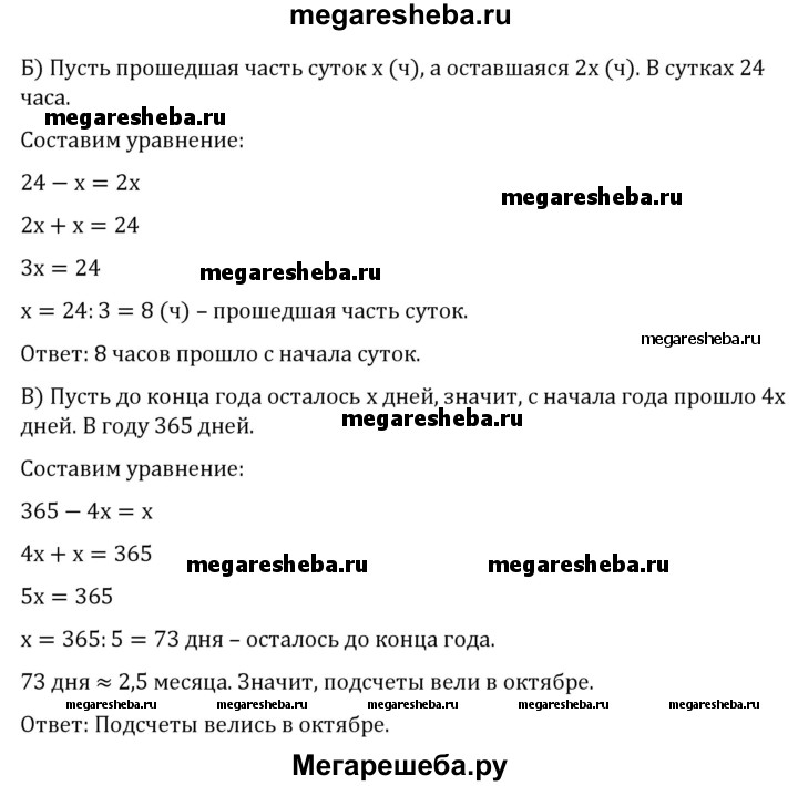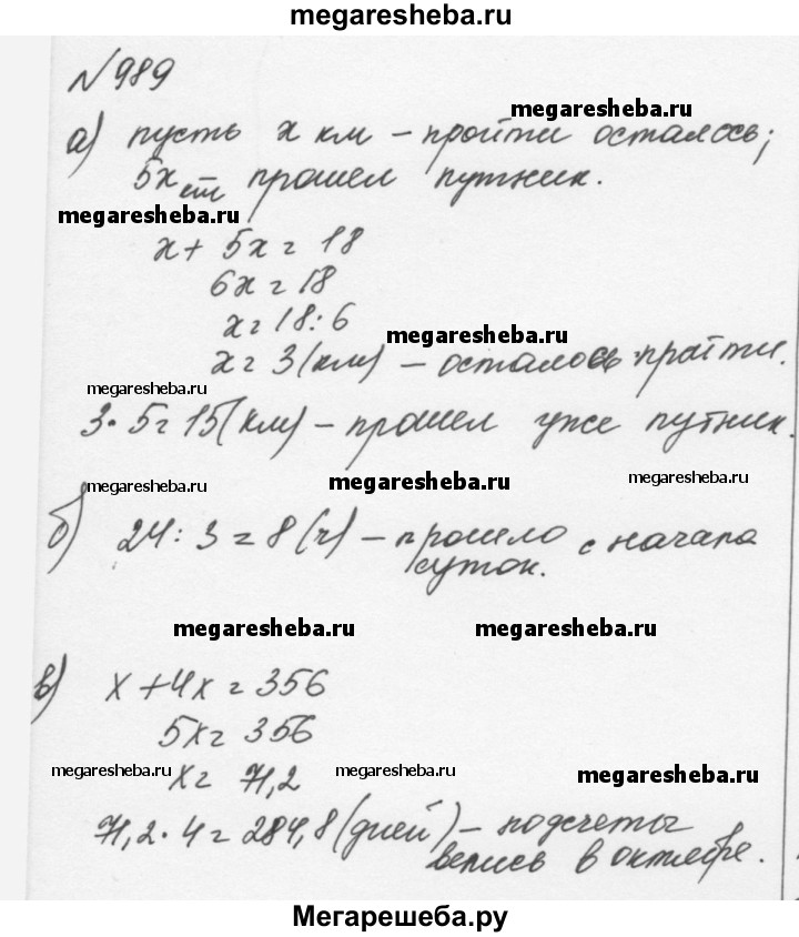 989. а) Расстояние между сёлами 18 км. Путник прошёл в 5 раз больше, чем осталось пройти. Сколько километров он уже прошёл? б) Некто подсчитал, что прошедшая часть суток в 2 раза меньше оставшейся. Сколько времени прошло с начала суток? в) Некто подсчитал, что с начала года прошло в 4 раза больше дней, чем осталось до конца года. В каком месяце он вёл подсчёты?