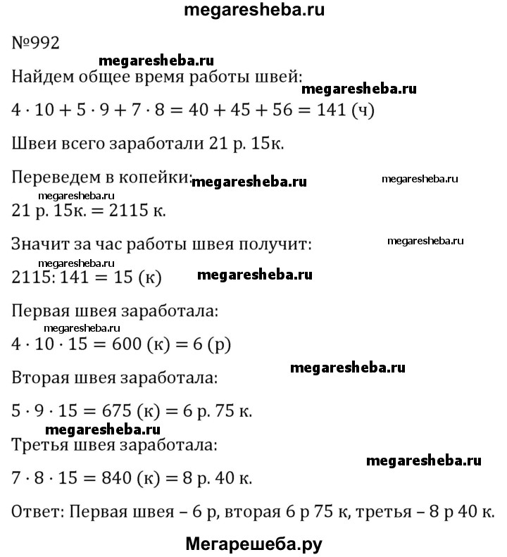 992. Старинная задача. Три швеи заработали в одном доме 21 р. 15 к., причём первая работала 4 дня по 10 ч ежедневно, вторая — 5 дней по 9 ч и третья — 7 дней по 8 ч. Сколько получит каждая из заработанной суммы сообразно времени, употреблённому на работу?