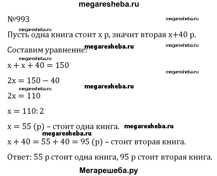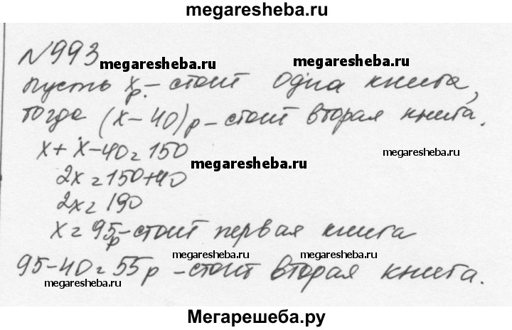 993. За две книги заплатили 150 р. Определите стоимость каждой книги, если известно, что одна из них на 40 р. дешевле.