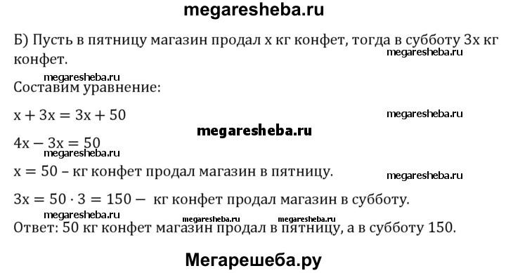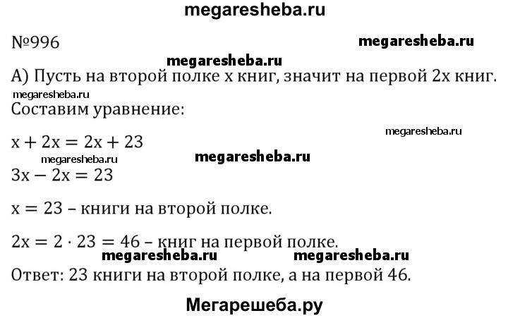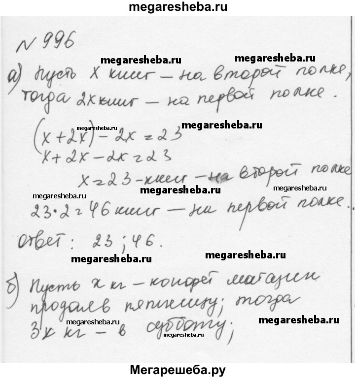 996. а) На первой полке в 2 раза больше книг, чем на второй, но на 23 книги меньше, чем на двух полках вместе. Сколько книг на каждой полке? б) В субботу магазин продал в 3 раза больше конфет, чем в пятницу, но на 50 кг меньше, чем за оба эти дня. Сколько килограммов конфет продано в каждый из этих дней?