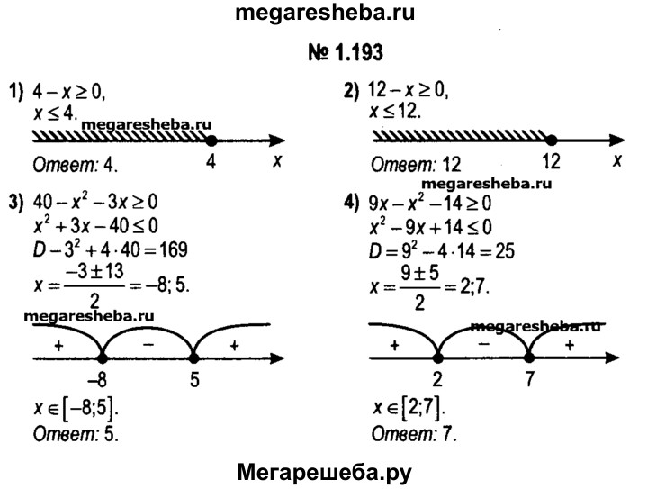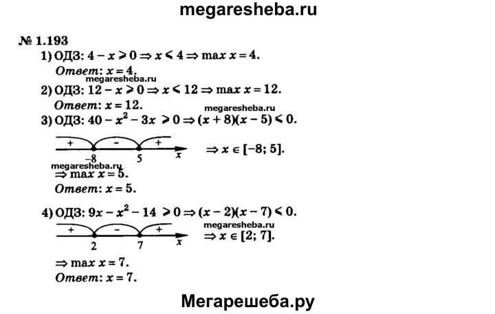 1.193. Найдите наибольшее целое значение х, принадлежащее области определения функции: 1) f(x) = (4-х)^9/20; 2) f(х) = (12-х)^15/4; 3) f(х) = (40-х2 -Зх)^6/23; 4) f(х) = (9х - х2 - 14)^12/7 .