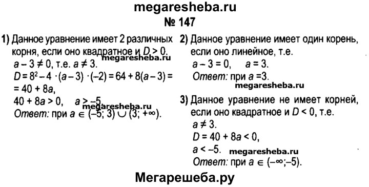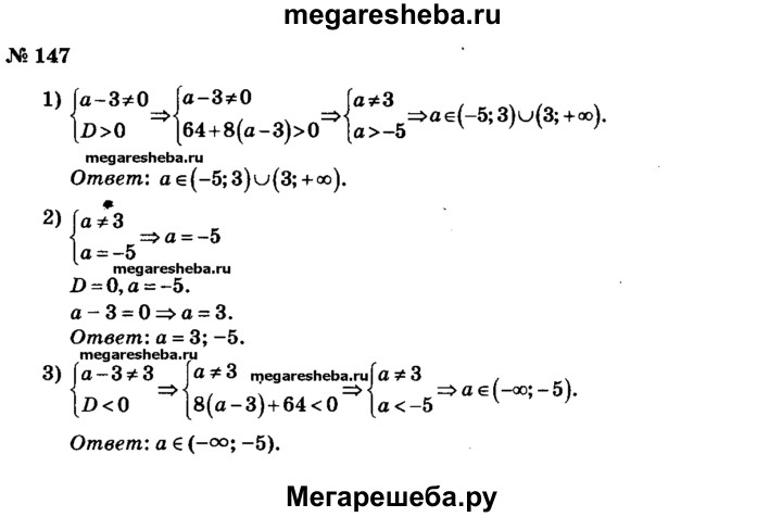147. При каких значениях а уравнение (а-3)х2 + 8х-2 = 0 имеет: 1) два корня; 2) один корень; 3) не имеет корней?