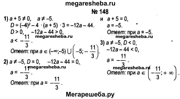 148. При каких значениях а уравнение (а + 5)х2 - 4х + 3 = 0 имеет: 1) два корня; 2) один корень; 3) не имеет корней?