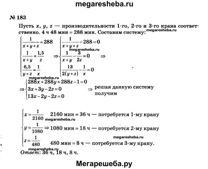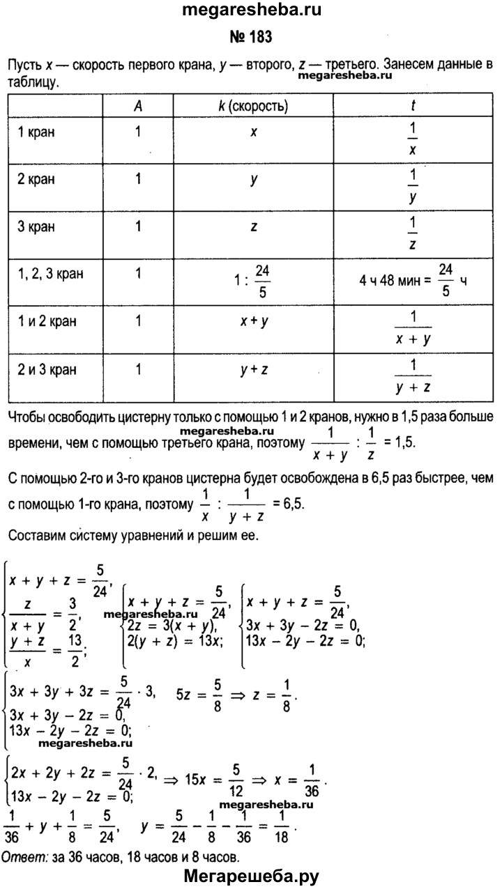 183. Через три крана цистерна может быть освобождена от содержащейся в ней жидкости за 4 ч 48 мин. Чтобы освободить цистерну только с помощью первого и второго кранов, понадобится в 1,5 раза больше времени, чем с помощью третьего крана. С помощью второго и третьего кранов цистерна будет освобождена от содержимого в 6,5 раза быстрее, чем с помощью только первого крана. За какое время цистерна может быть освобождена от содержимого с помощью каждого крана отдельно?