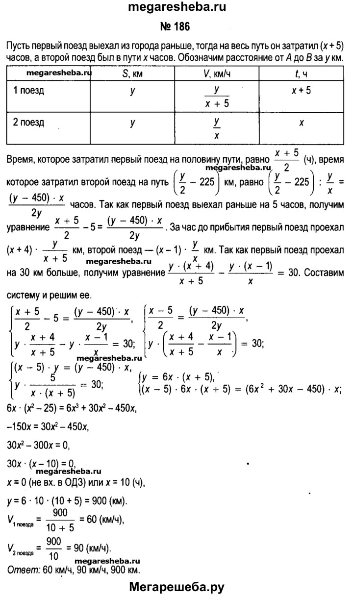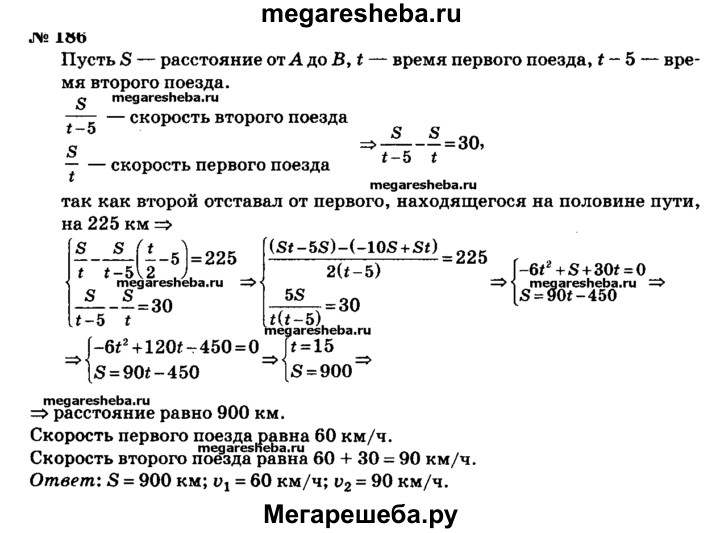 186. Два поезда выехали из города А в город В с интервалом 5 ч и одновременно прибыли в город В. Когда первый поезд находился в середине пути, второй отставал от него на 225 км, а за час до прибытия расстояние между поездами было равно 30 км. Найдите скорости поездов и расстояние между городами.