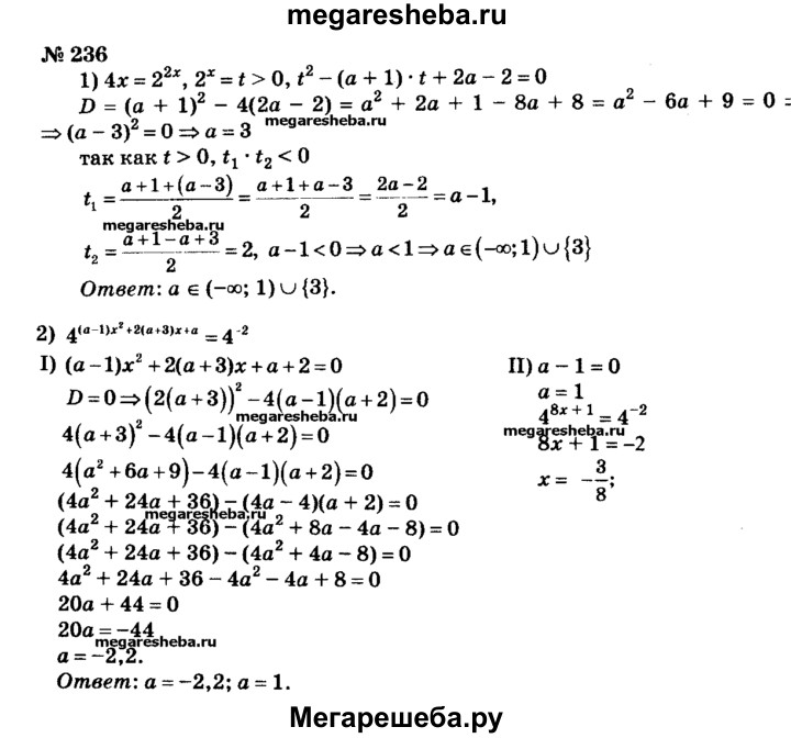 236. 1) При каких значениях а уравнение 4x - (а + 1) * 2x + 2а - 2 = 0 имеет один корень? 2) При каких значениях а уравнение 4^(a-1)x2+2(a+3)x+a = 1/16 имеет один корень?