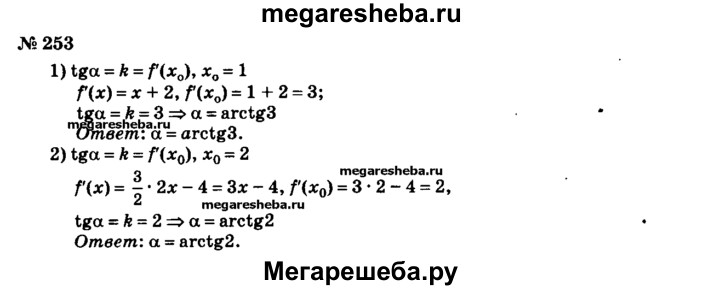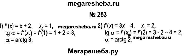 253. Найдите угол наклона к оси Ох касательной к графику функции у = f(x), проходящей через точку Р, если: 1) f(x) = 1/2x2 + 2x -0,5, Р( 1; 2); 2) f(x) = 3/2x2 – 4x + 6, Р(2; 4).