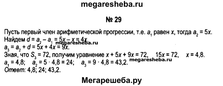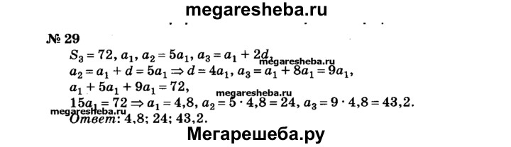 29. Сумма трех последовательных членов арифметической прогрессии (аn) равна 72. Второй член больше первого в 5 раз. Найдите эти три члена прогрессии (аn).