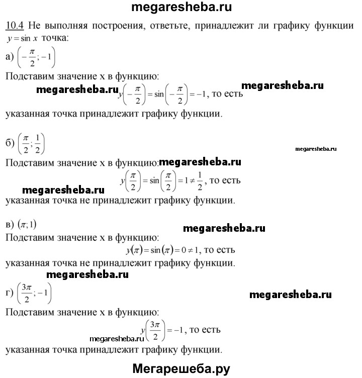 10.4. Не выполняя построения, ответьте, принадлежит ли графику функции y = sinx точка: а) (-π/2;-1) б) (π/2 ; 1/2) в) (π; 1); г) (3π/2;-1)