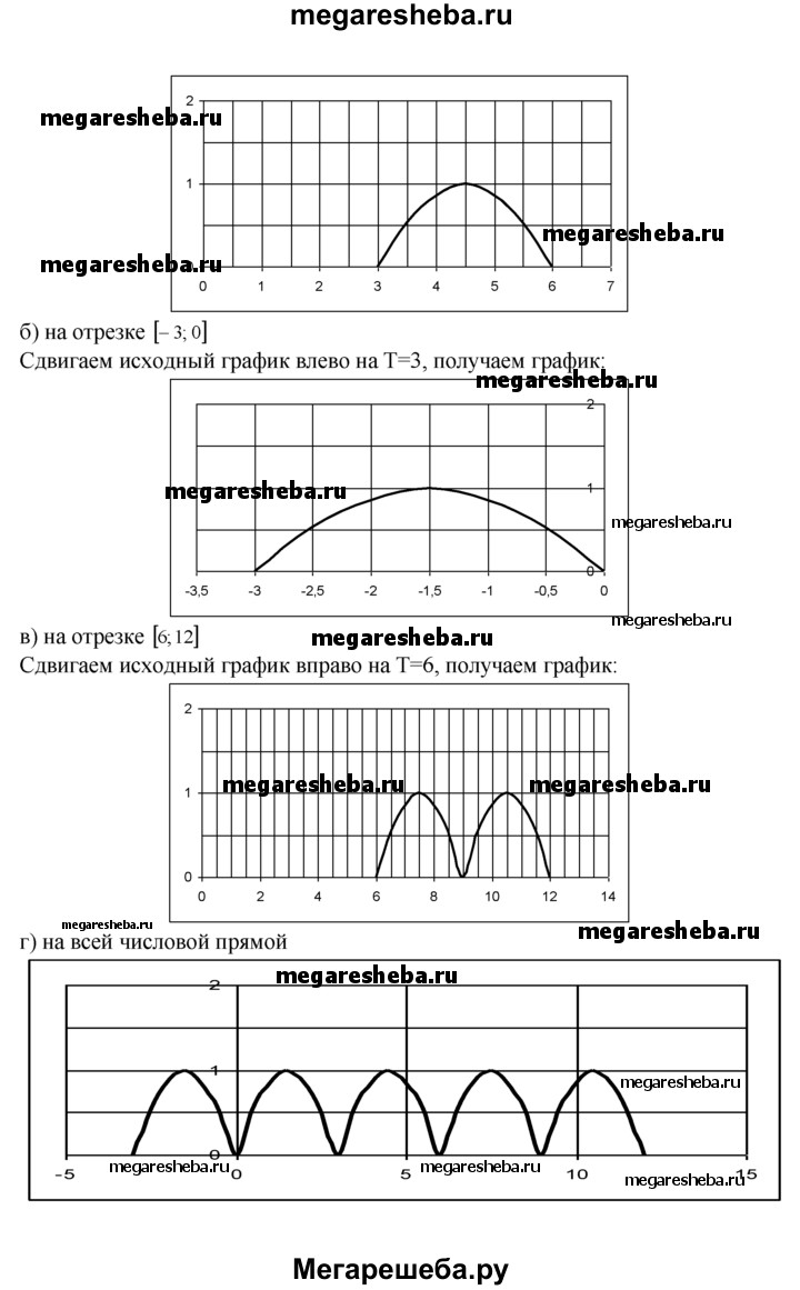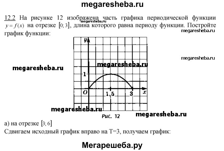 12.2. На рисунке 12 изображена часть графика периодической функции у = f(x) на отрезке [0;3], длина которого равна периоду функции. Постройте график функции: а) на отрезке [3; 6]; б) на отрезке [-3; 0]; в) на отрезке [6; 12]; г) на всей числовой прямой.