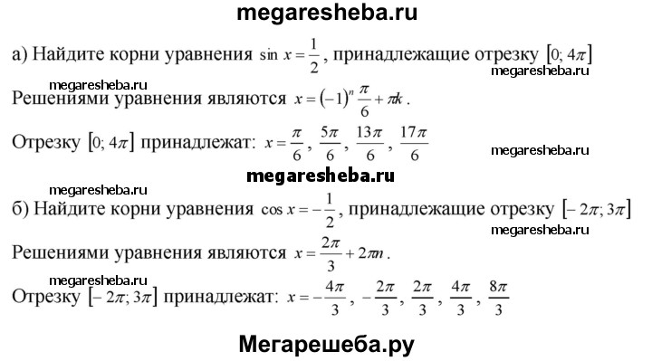 18.14. а) Найдите корни уравнения sin x = 1/2, принадлежащие отрезку [0; 4π]. б) Найдите корни уравнения cos х = -1/2 , принадлежащие отрезку [-2π; Зπ].