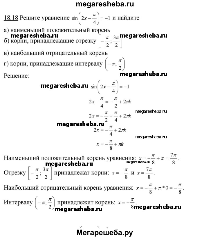 18.18. Решите уравнение sin ( 2х – π/4) = -1 и найдите: а) наименьший положительный корень; б) корни, принадлежащие отрезку в) наибольший отрицательный корень; г) корни, принадлежащие интервалу
