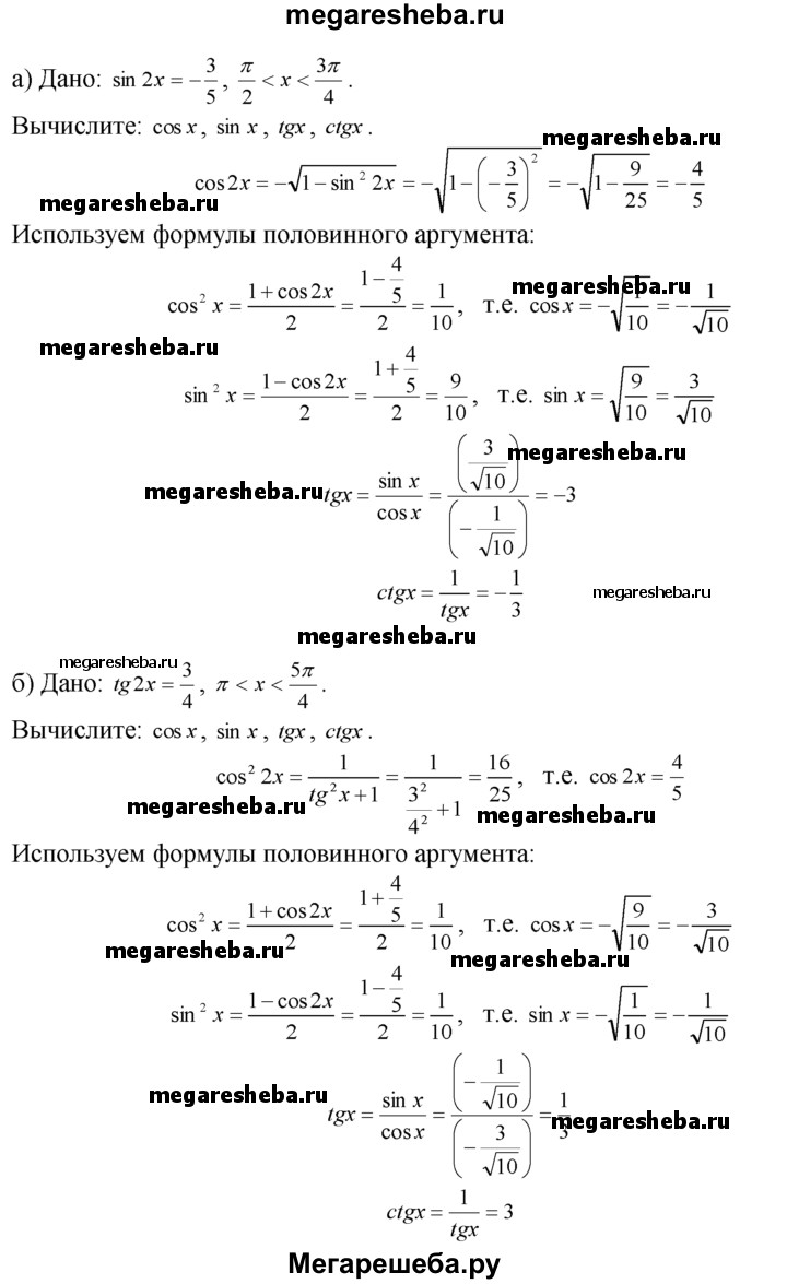21.12. а) Дано: sin 2x = -3/5, π/2 < x < 3π/4. Вычислите: cos x; sin x; tgx; ctgx. б) Дано: tg 2x = 3/4, π < x < 5π/4. Вычислите: cos x; sin x; tgx; ctgx.?