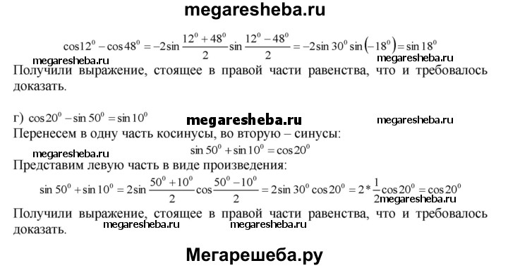 22.8. Проверьте равенство: а) sin 35° + sin 25° = cos 5°; б) sin 40° + cos 70° = cos 10°; в) cos 12° - cos 48° = sin 18°; г) cos 20° - sin 50° = sin 10°.