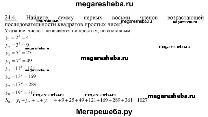 24.4. Найдите сумму первых восьми членов возрастающей последовательности квадратов простых чисел. Указание: число 1 не является ни простым, ни составным. Составьте одну из возможных формул n-го члена последовательности по первым пяти ее членам.