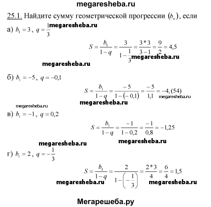 25.1. Найдите сумму геометрической прогрессии (bп), если: а) b1= 3, q = 1/3; б) b1 = -5, q = -0,1; в) b1 = -1, q = 0,2; г) b1 = 2, g = -1/3.