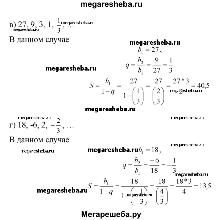 25.2. Найдите сумму геометрической прогрессии: а) 32, 16, 8, 4, 2, ... б) 24, -8, 8/3, -8/9 ... ; в) 27, 9, 3, 1, 1/3 … г) 18, -6, 2, -2/3, ... .