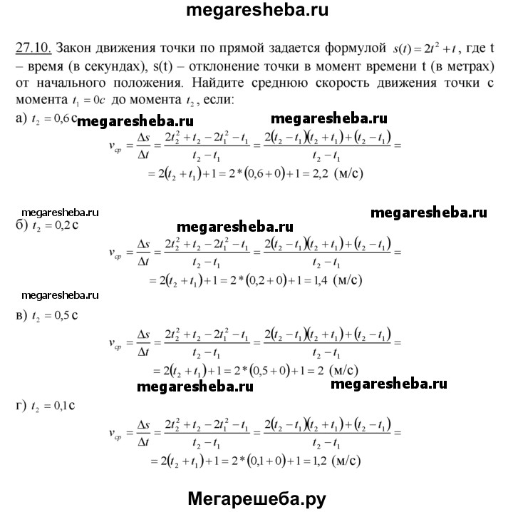 27.10. Закон движения точки по прямой задается формулой s(t) = 212 + t, где t — время (в секундах), s(t)— отклонение точки в момент времени t (в метрах) от начального положения. Найдите среднюю скорость движения точки с момента t1 = 0с до момента t2, если: а) t2 = 0,6 с; б) t2 = 0,2 с; в) t2 = 0,5 с; г) t2 = 0,1 с.