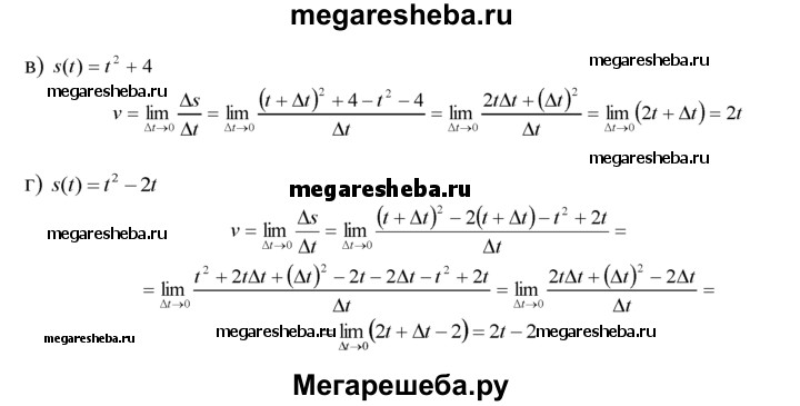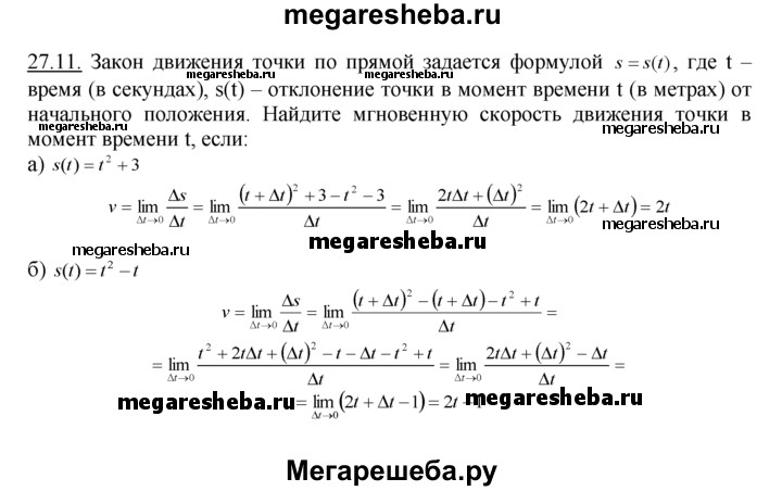 27.11. Закон движения точки по прямой задается формулой s = s(t), где t — время, s(t) — отклонение точки в момент времени t от начального положения. Найдите мгновенную скорость движения точки в момент времени t, если: а) s(t) = t2 + 3; б) s(t) = t2 -t; в) s(t) = t2 + 4; г) s(t) = t2 - 21.