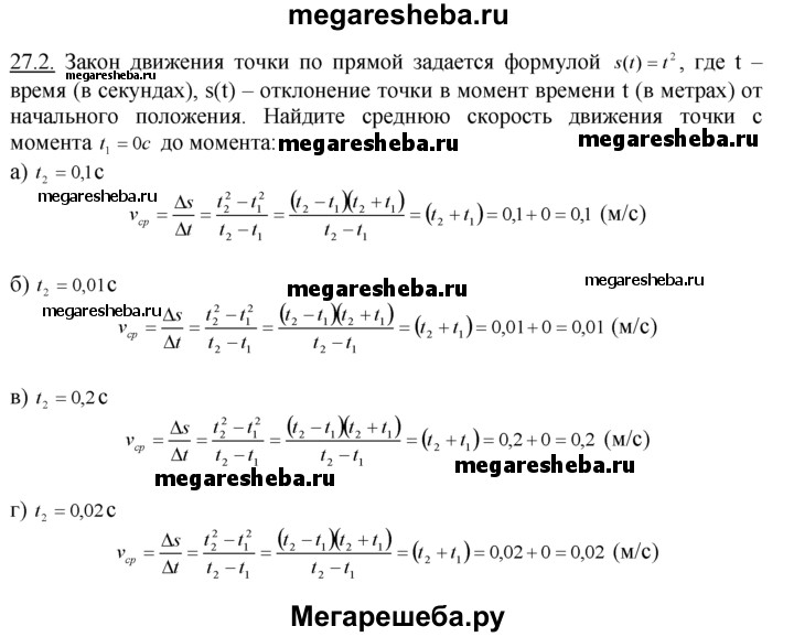 27.2. Закон движения точки по прямой задается формулой s(t) = t2, где t— время (в секундах), s(t)— отклонение точки в момент времени t (в метрах) от начального положения. Найдите среднюю скорость движения точки с момента t1 =0 с до момента: а) t2 = 0,1 с; б) t2 = 0,01 с; в) t2 = 0,2 с; г) t2 = 0,02 с.