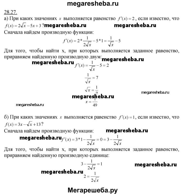 28.27. а) При каких значениях x выполняется равенство f'(х) = 2, если известно, что f(x) = 2√х - 5х + 3? б) При каких значениях х выполняется равенство f(x) = 1, если известно, что f(x) = Зх - √x +13?