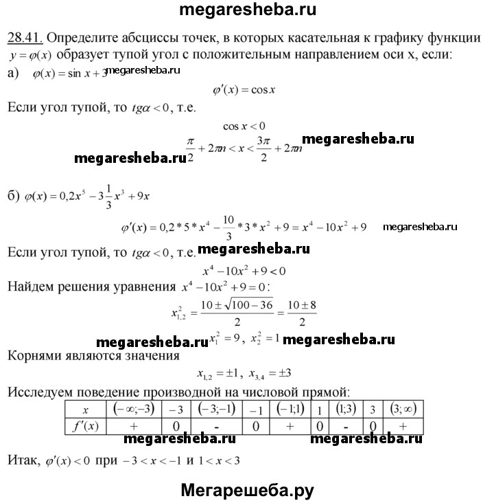 28.41. Определите абсциссы точек, в которых касательная к графику функции у = ф(х) образует тупой угол с положительным направлением оси х, если: а) ф(х) = sin х + 3; б) ф(х) = 0,2х - 3-х3 + 9х.