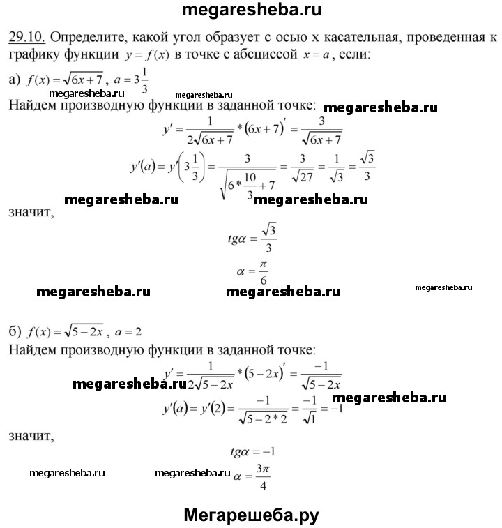 29.10. Определите, какой угол образует с осью х касательная, проведенная к графику функции у = f(x) в точке с абсциссой х = а, если: a) f(x) = √6х + 7 , а = 3*1/3; б) f(x) = √5 - 2х , а = 2.