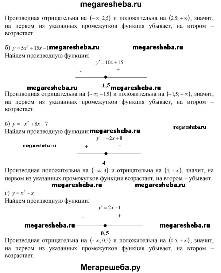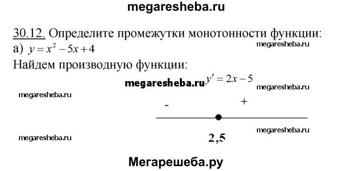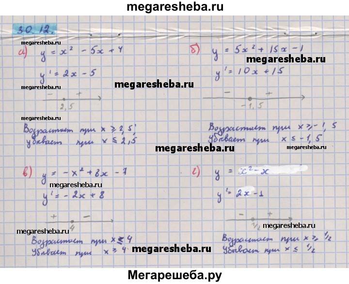 30.12. Определите промежутки монотонности функции: а) у = х2 - 5х + 4; б) у = 5х2 + 15х - 1; в) у = -х2 + 8х - 7; г) у = х2 - х.