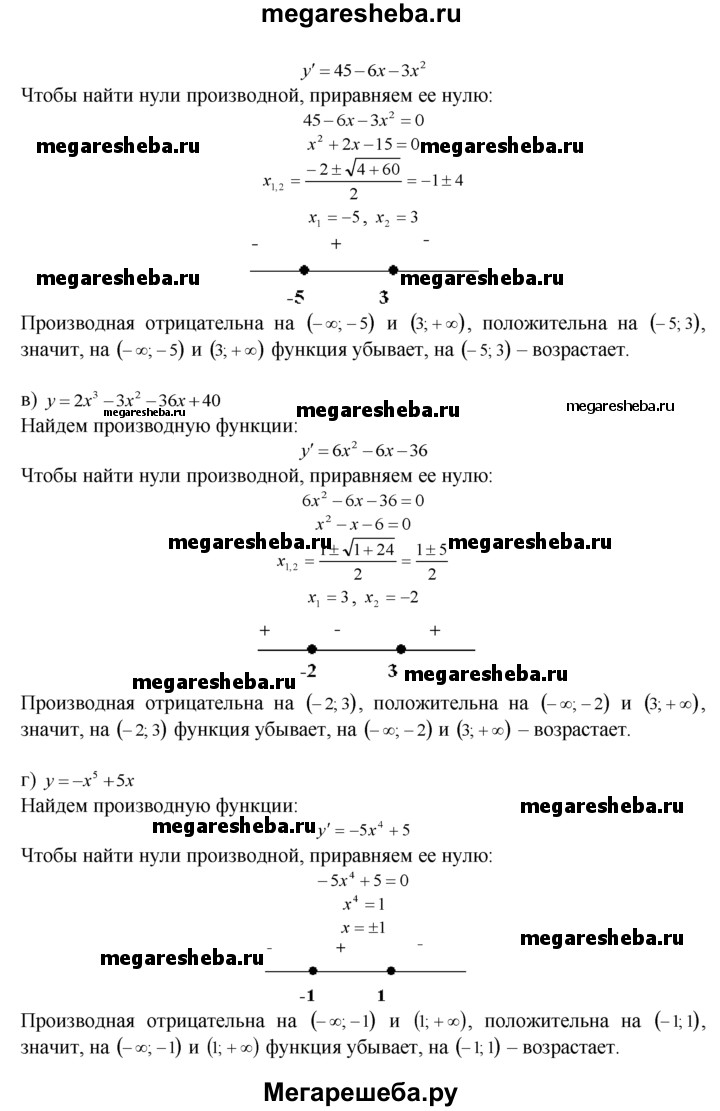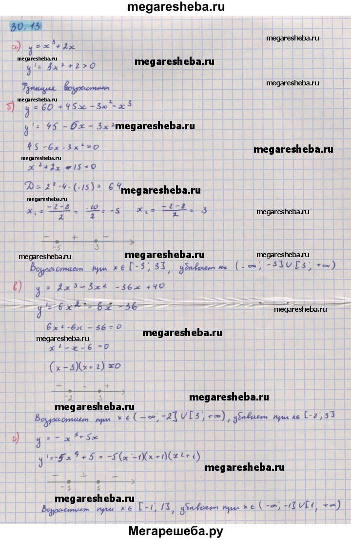 30.13. Определите промежутки монотонности функции: а) у = х3 + 2х; б) у = 60 + 45x - Зх2 - х3; в) у = 2х3 - Зх2 - 36х + 40; г) у = -х5 + 5х.