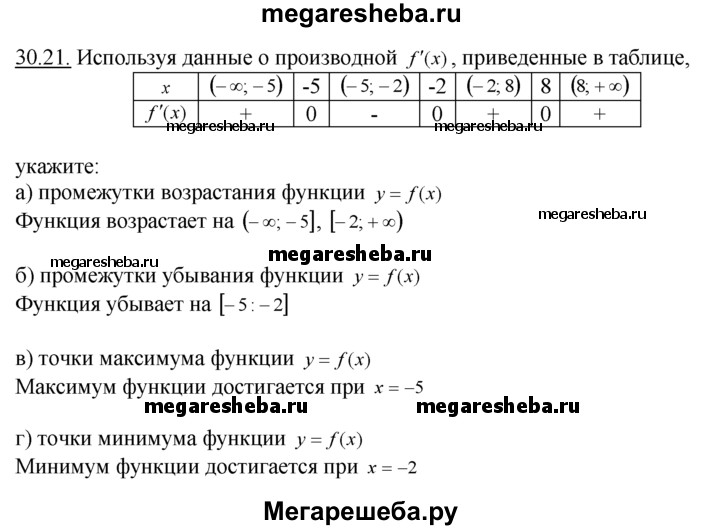 30.21. Используя данные о производной f'(x), приведенные в таблице, укажите: а) промежутки возрастания функции у = f(х); б) промежутки убывания функции у = f(х); в) точки максимума функции у = f(x); г) точки минимума функции у = f(x).