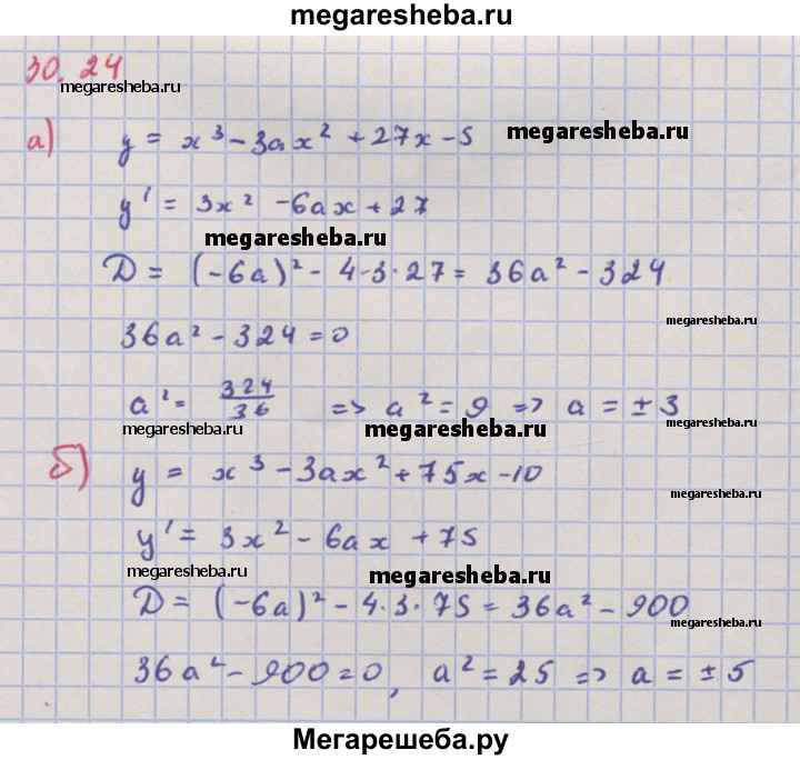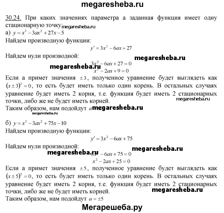 30.24. При каких значениях параметра а заданная функция имеет одну стационарную точку: а) у = х3 - 3ах2 + 27х - 5; б) у = х3 - 3ах2 + 75х - 10?
