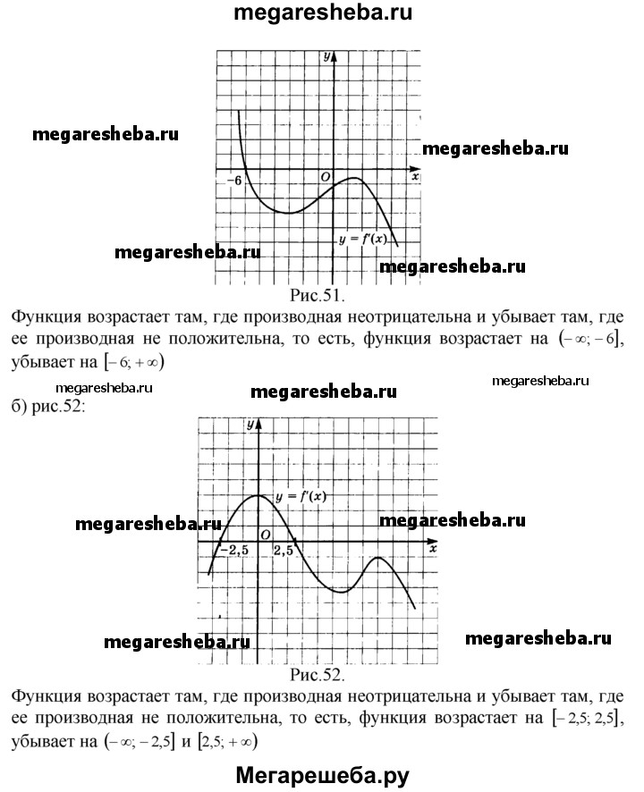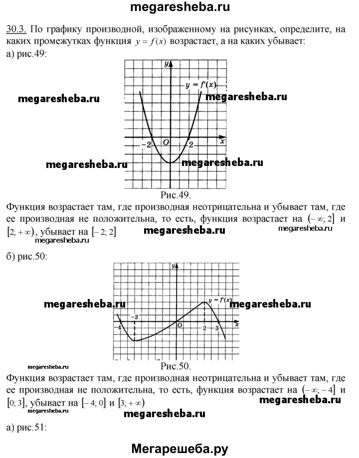 30.3. По графику производной, изображенному на рисунках, определите, на каких промежутках функция у = f(x) возрастает, а на каких — убывает: а) рис. 49; б) рис. 50; в) рис. 51; г) рис. 52.?