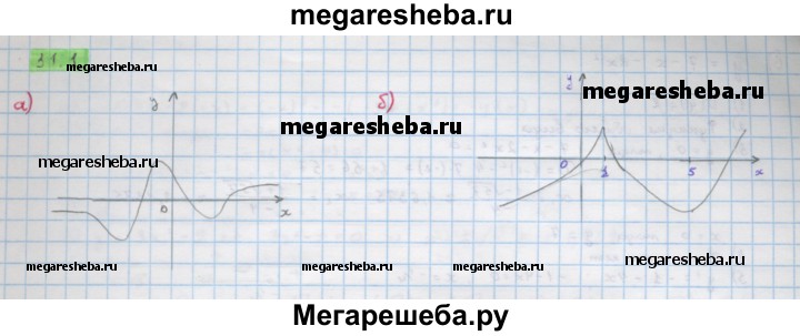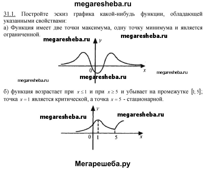 31.1. а) Функция имеет две точки максимума, одну точку минимума и является ограниченной; б) функция возрастает при х ≤ 1 и при х ≥ 5 и убывает на промежутке [1; 5]; точка х = 1 является критической, а точка х = 5— стационарной.