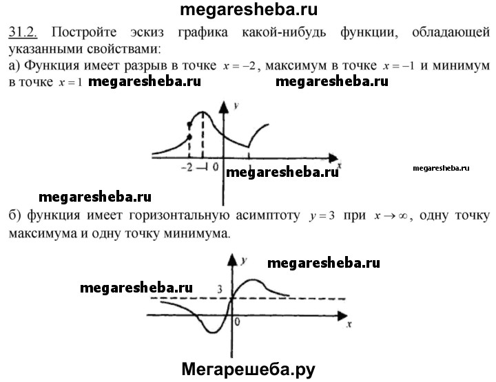 31.2. а) Функция имеет разрыв в точке х = -2, максимум в точке х = -1 и минимум в точке х = 1; б) функция имеет горизонтальную асимптоту у = 3 при х —> ∞, одну точку максимума и одну точку минимума.