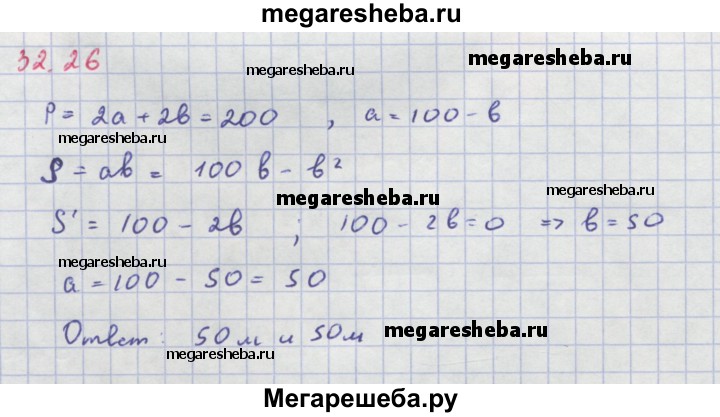 32.26. Нужно огородить участок прямоугольной формы забором длиной 200 м. Каковы должны быть размеры этого прямоугольника, чтобы его площадь была наибольшей?
