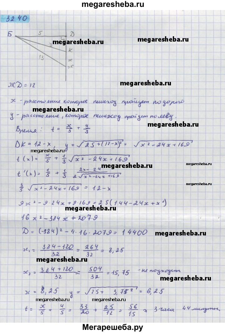 32.40. База находится в лесу в 5 км от дороги, а в 13 км от базы на этой дороге есть железнодорожная станция. Пешеход по дороге идет со скоростью 5 км/ч, а по лесу— 3 км/ч. За какое минимальное время пешеход может добраться от базы до станции?