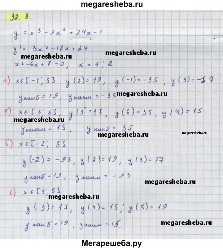 32.8. Найдите наибольшее и наименьшее значения функции у = х3 - 9х2 + 24x - 1 на отрезке: а) [-1; 3]; б) [3; 6]; в) [-2; 3]; г) [3; 5].