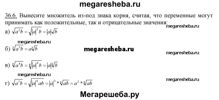 36.6. Вынесите множитель из-под знака корня, считая, что переменные могут принимать как положительные, так и отрицательные значения: a) √a2b; б) 3√a3b; в) 4√a4b; г) √a5b