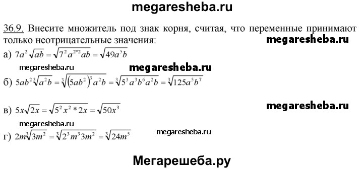 36.9. Внесите множитель под знак корня, считая, что переменные принимают только неотрицательные значения: а) 7a2√ab; б) 5ab2 3√a2b; в) 5x√2х; г) 2m3√3m2.