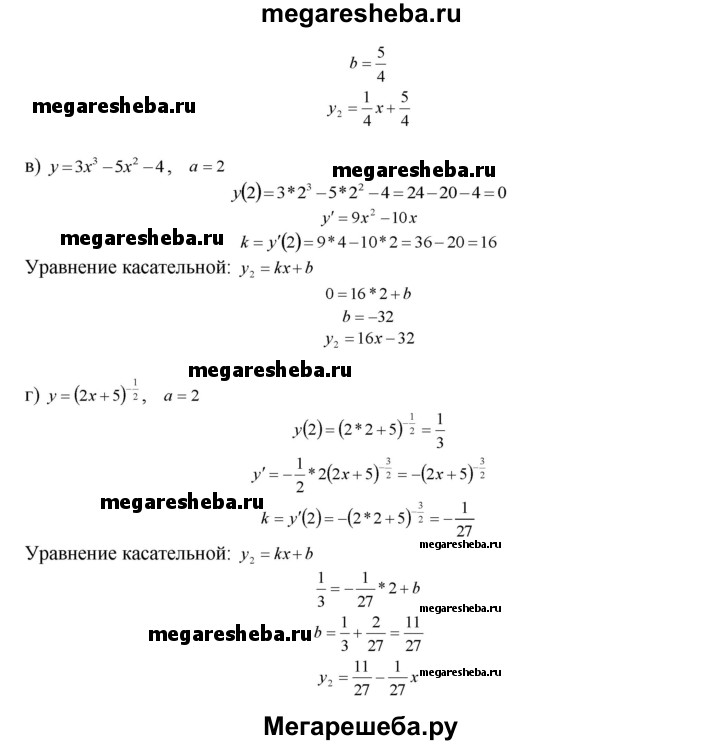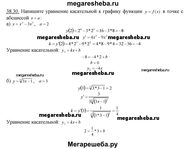 38.30. Напишите уравнение касательной к графику функции y=f(x) в точке с абсциссой х=а: а) у = х4 - Зх3, а = 2; б) у = 3√Зх - 1, а = 3; в) у = Зх3 - 5х2 - 4, а = 2; г) у = (2х + 5)1/2, а = 2.
