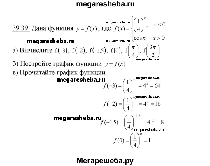 39.39. Дана функция у = f(x), где f(x) = а) Вычислите f(-3); f(-2); f(-1,5); f(0); f(π/4); f(3π/2); б) постройте график функции у = f(x); в) прочитайте график функции.