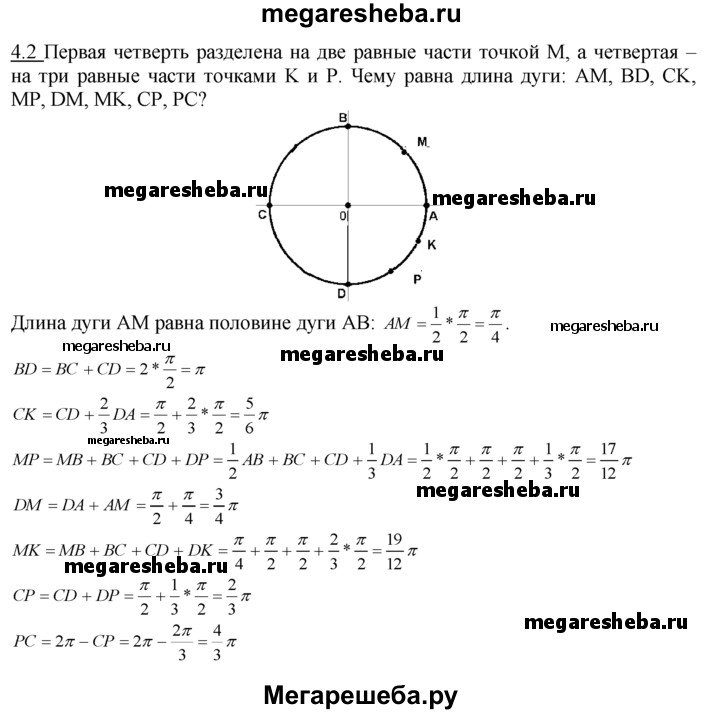 4.2. Первая четверть разделена на две равные части точкой М, а четвертая — на три равные части точками К и Р. Чему равна длина дуги: AM, BD, СК, MP, DM, МК, CP, PC?