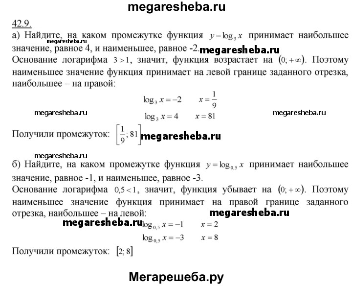 42.9. а) Найдите, на каком промежутке функция у = log3x принимает наибольшее значение, равное 4, и наименьшее, равное -2. б) Найдите, на каком промежутке функция у = log0,5x принимает наибольшее значение, равное -1, и наименьшее, равное -3.