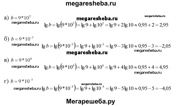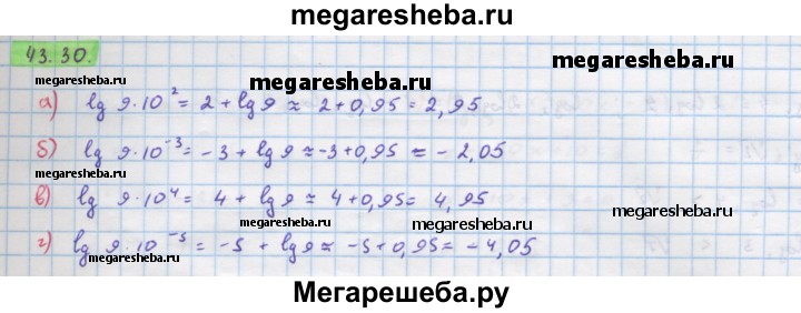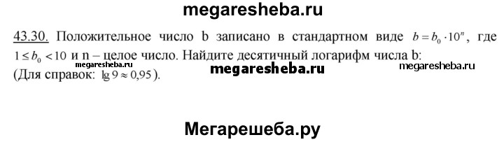 43.30. Положительное число b записано в стандартном виде b = b0 * 10n , где 1 ≤ b0 < 10 и n — целое число. Найдите десятичный логарифм числа b: а) b = 9 * 10^2; б) b = 9 * 10^-3; в) b = 9 * 10^4; г) b = 9 * 10^-5. (Для справок: lg9 ≈ 0,95.)